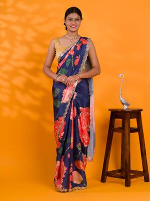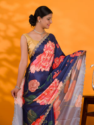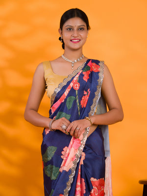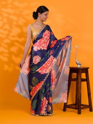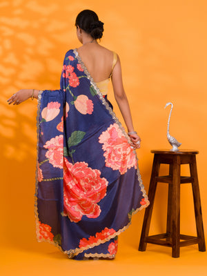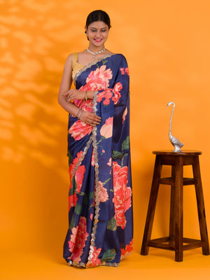 Tanmira Chinon Crape Floral Print Gotapatti Cutwork Border Sarees sana Navy Blue