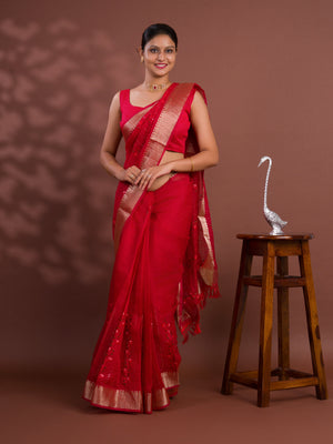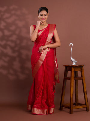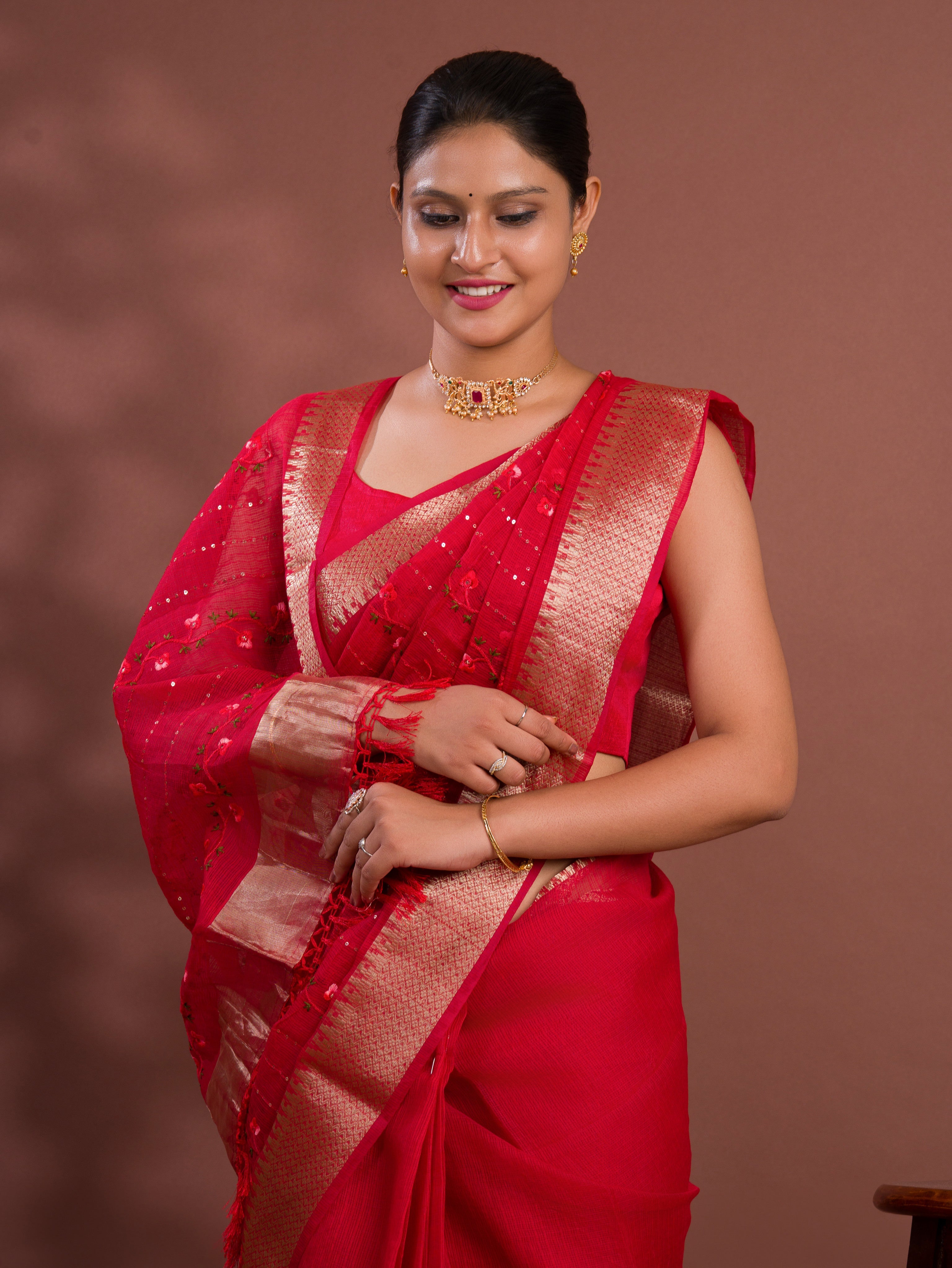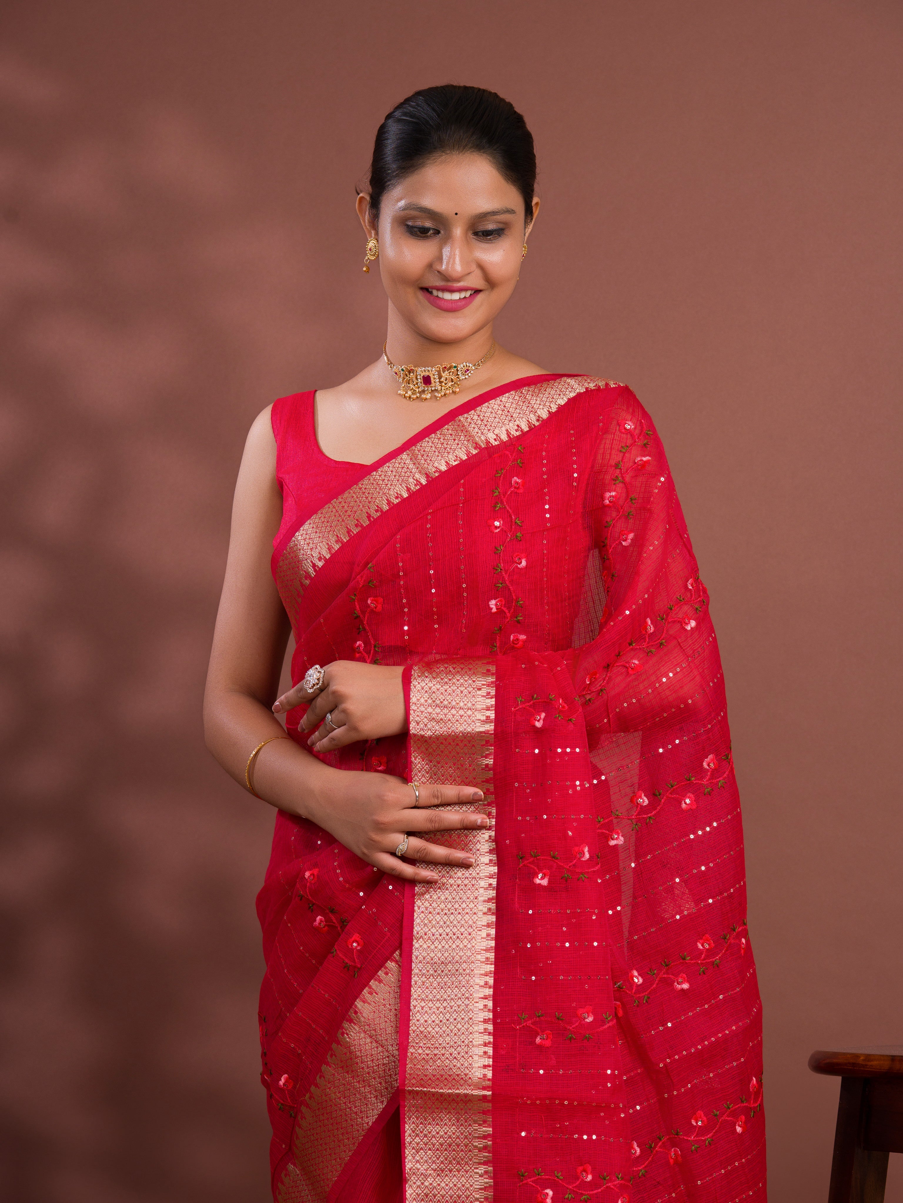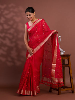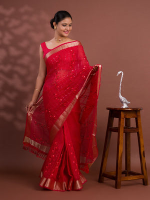 Tanmira Kota Doria Kashida Work Gotapatti Style Bikaneri Saree SNA Red