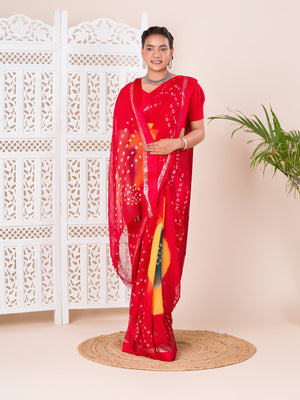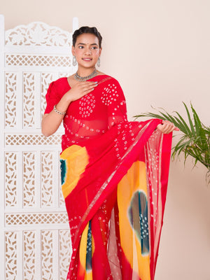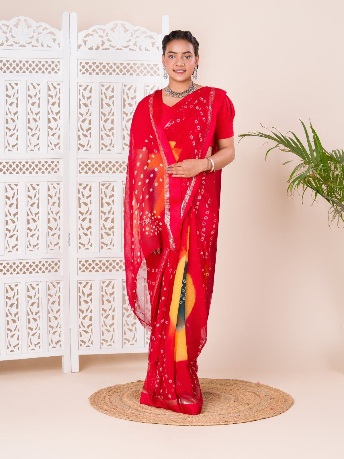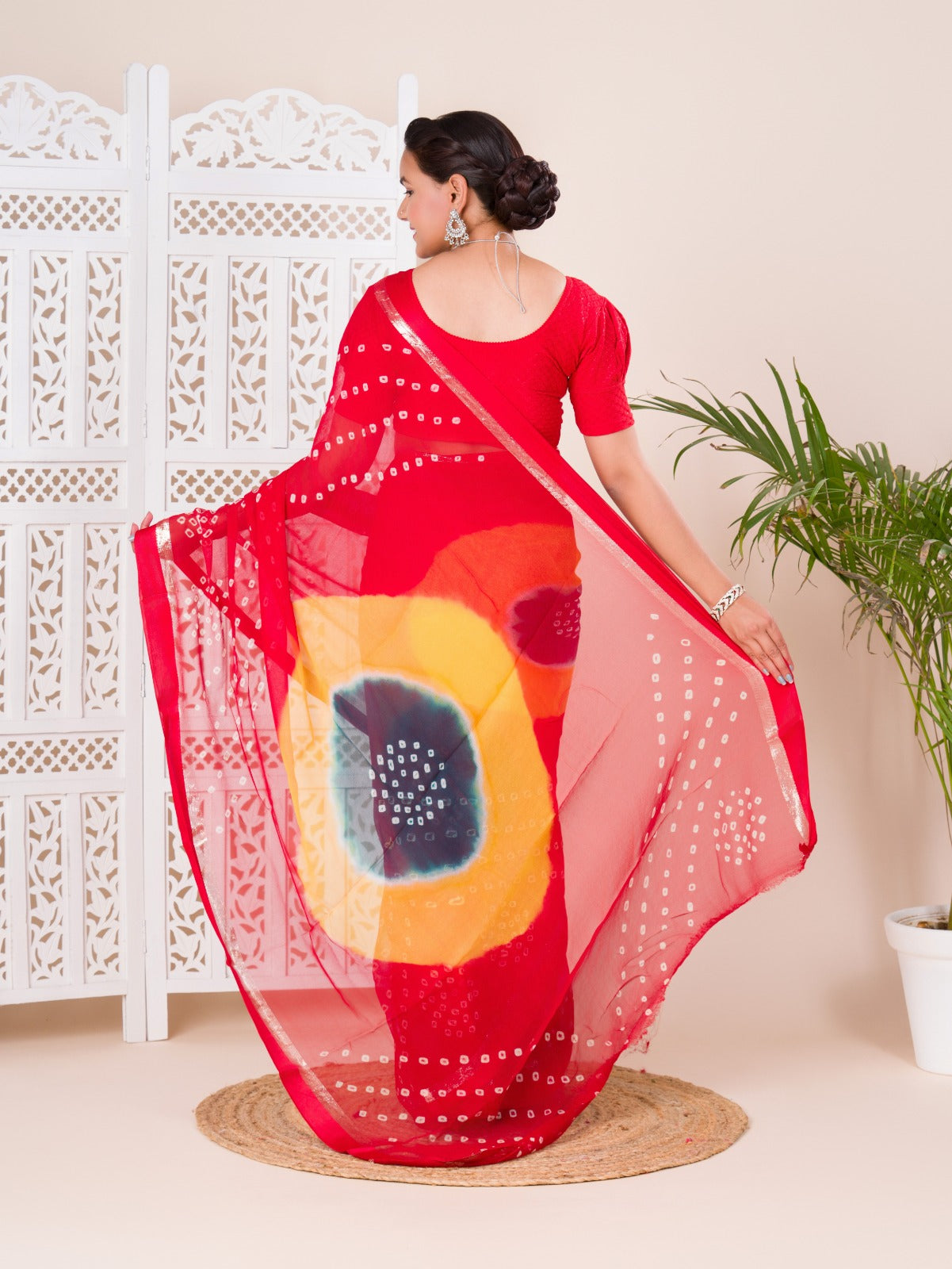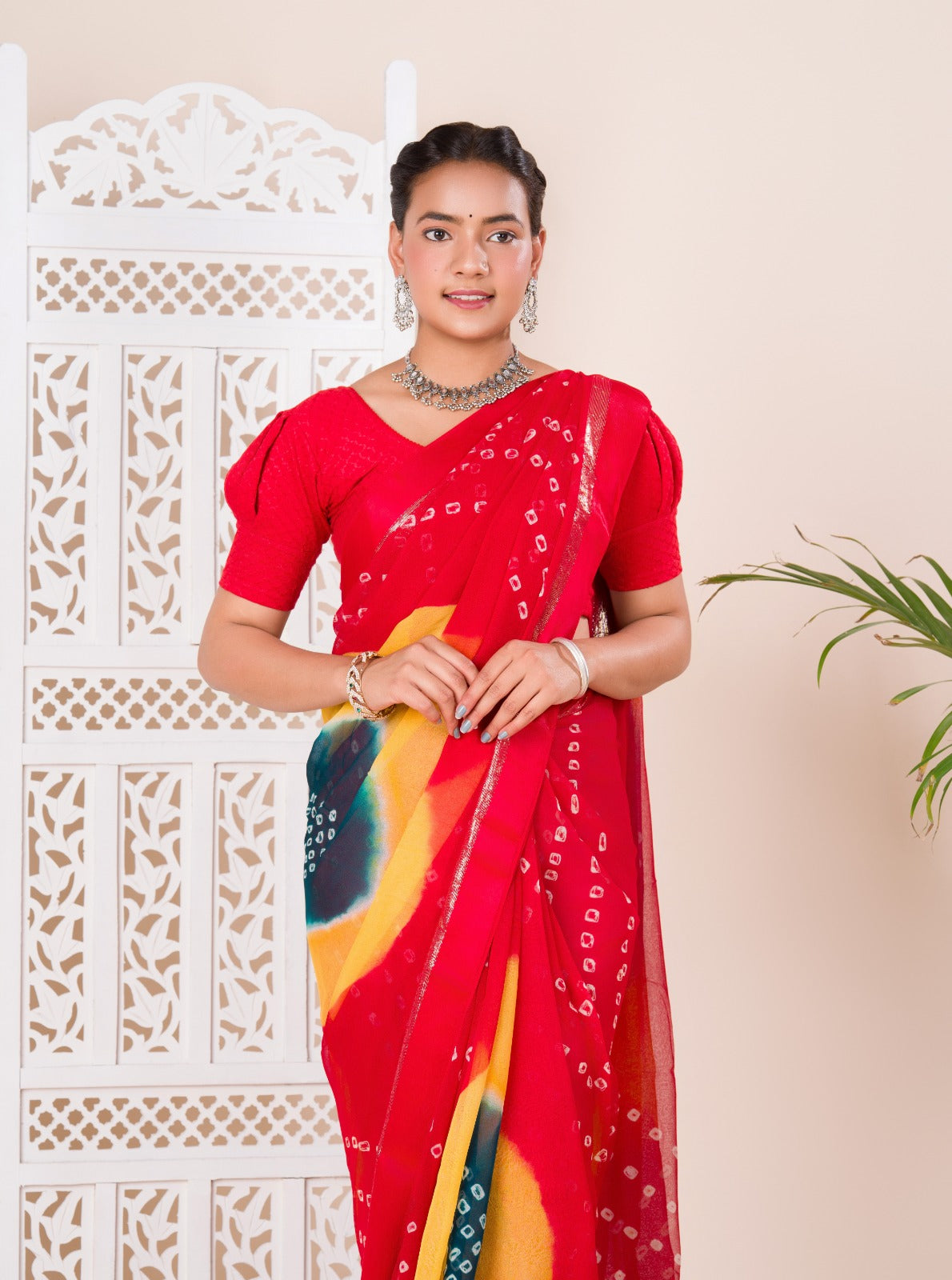 Tanmira New Pure Georgette Multi Colour Satin Patta Border Bandhni saree LAL