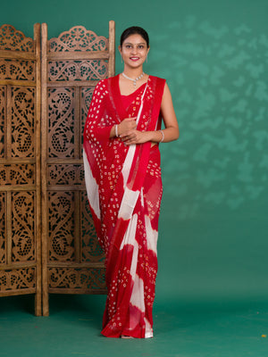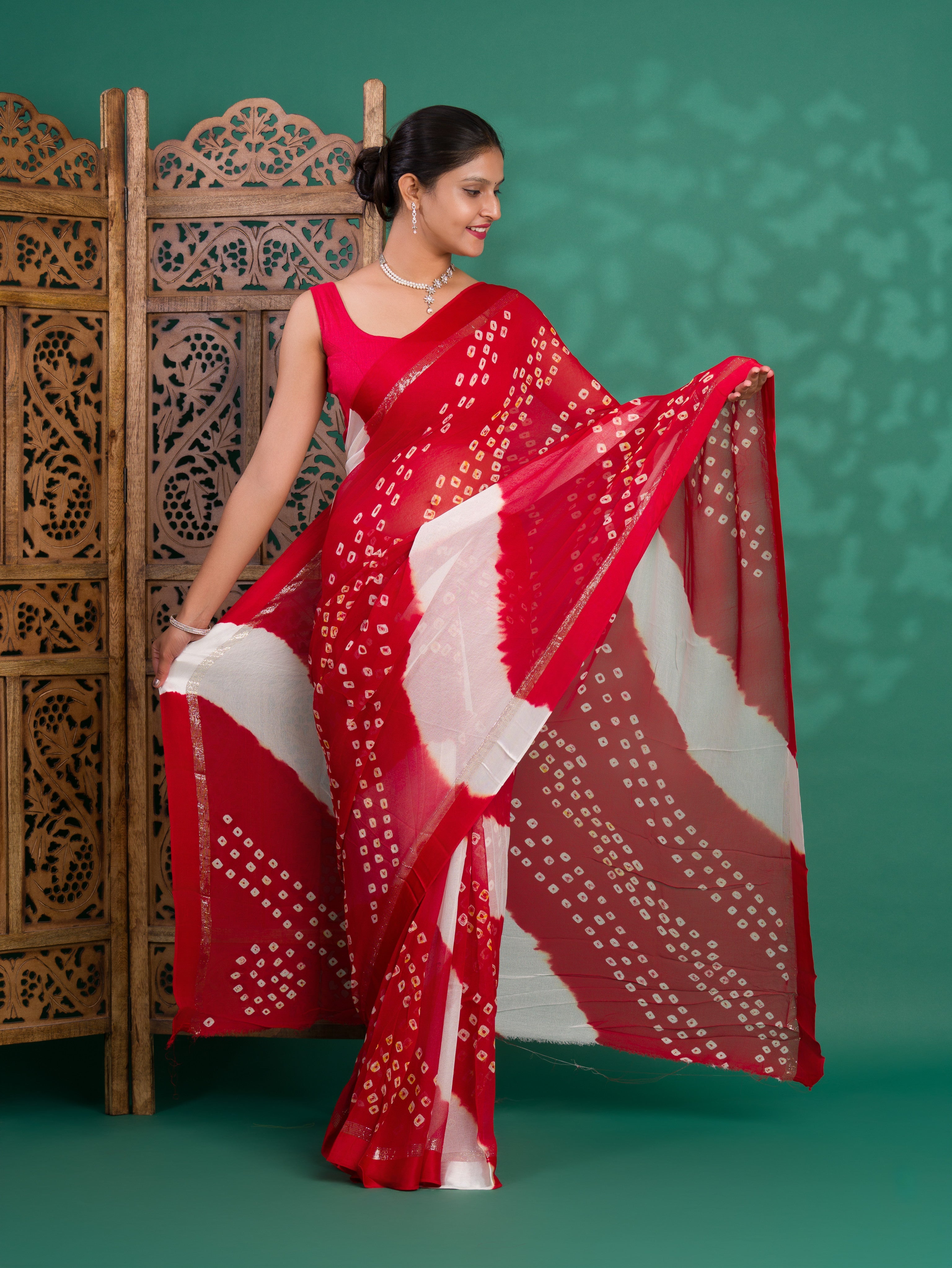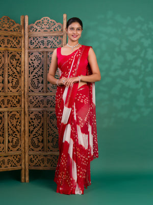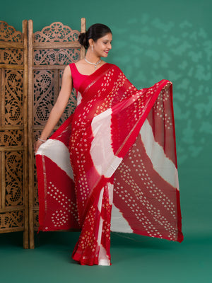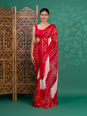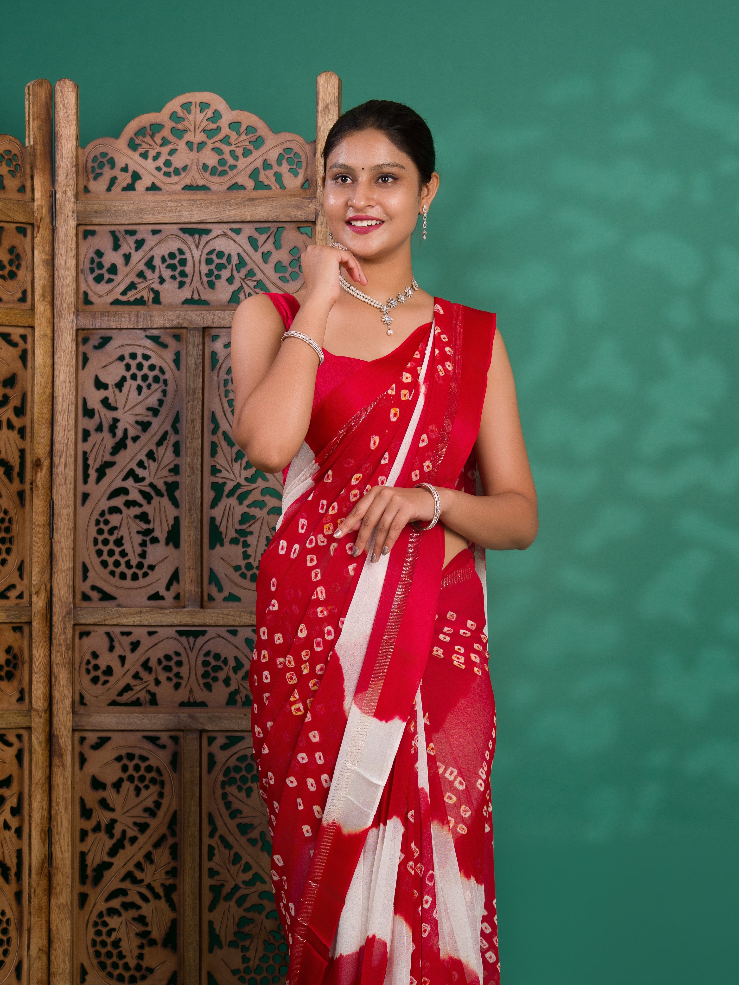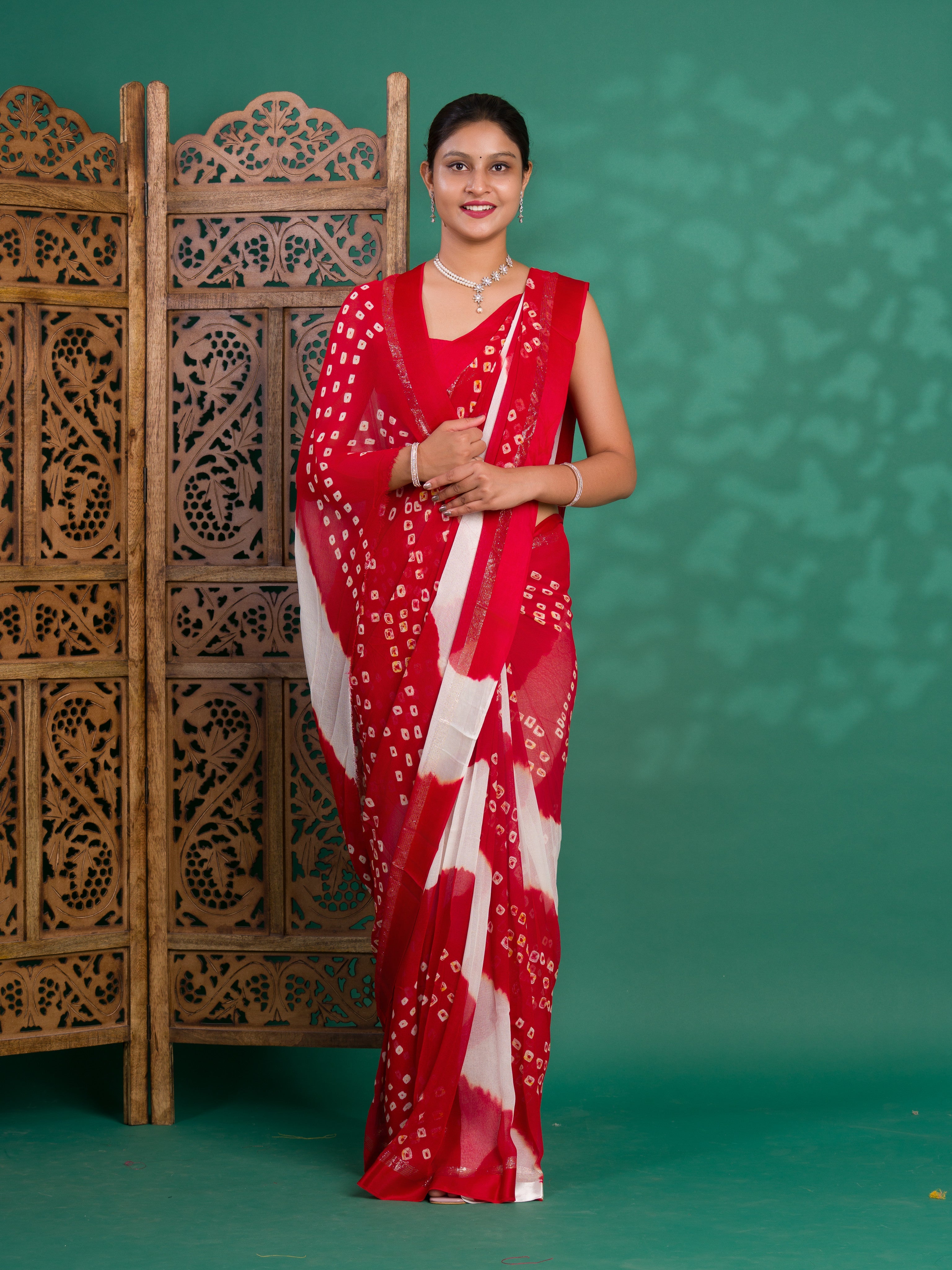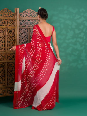 Tanmira New Pure Georgette Multi Colour Satin Patta Border Bandhni saree LAL